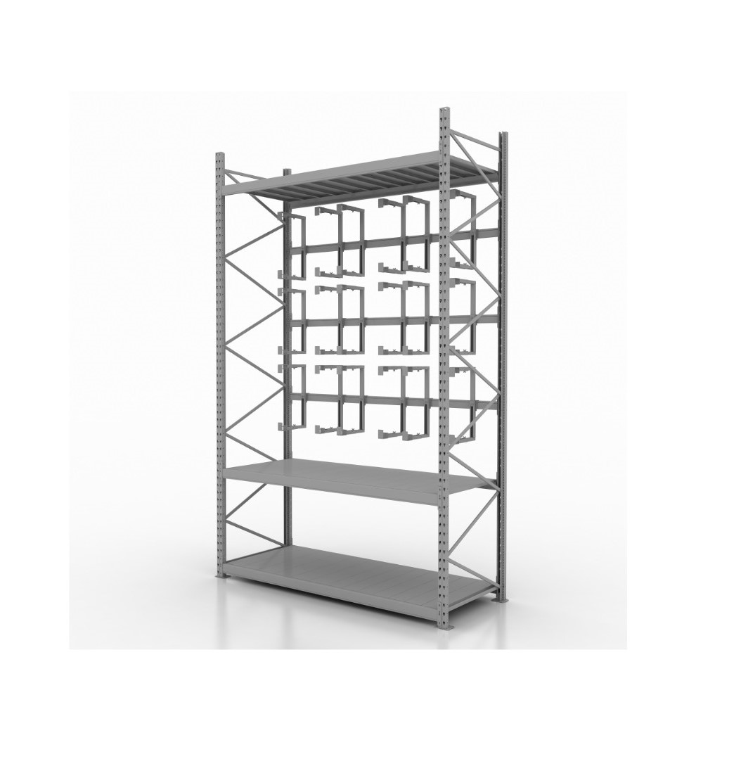 Держатели устанавливаются на горизонтальных штангах на разных уровнях, создавая компактную вертикальную экспозицию.