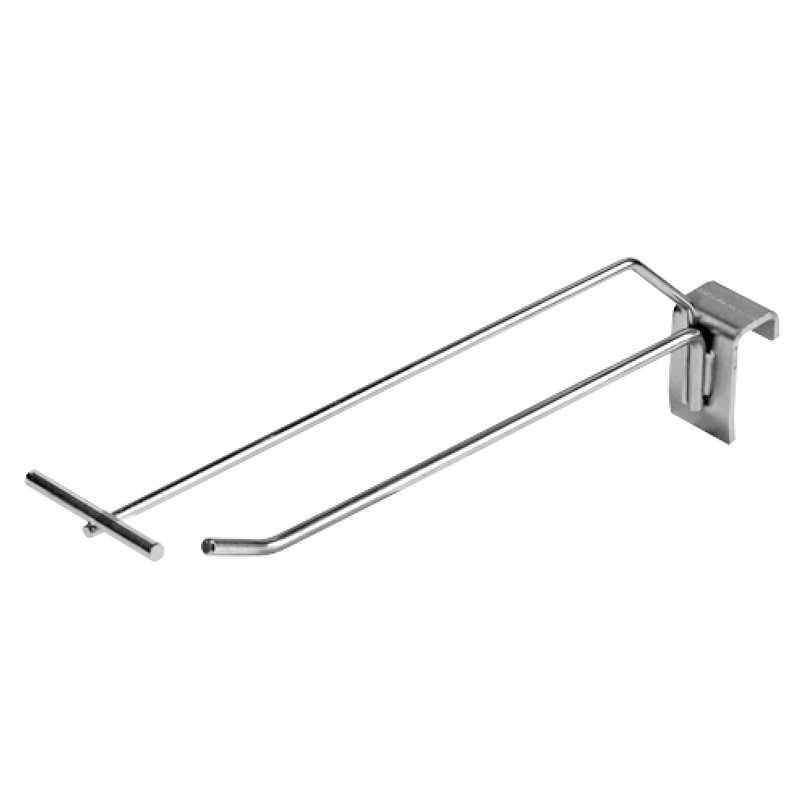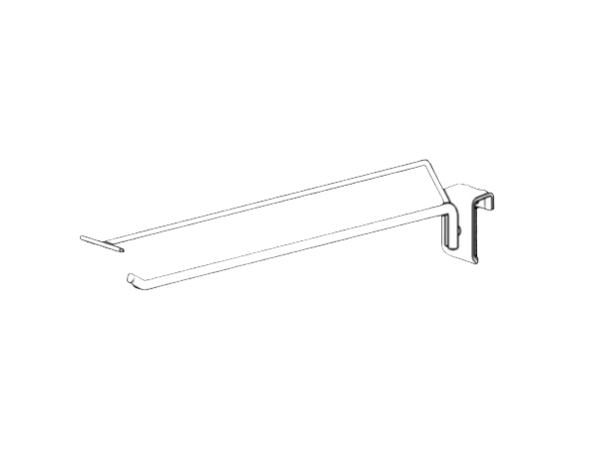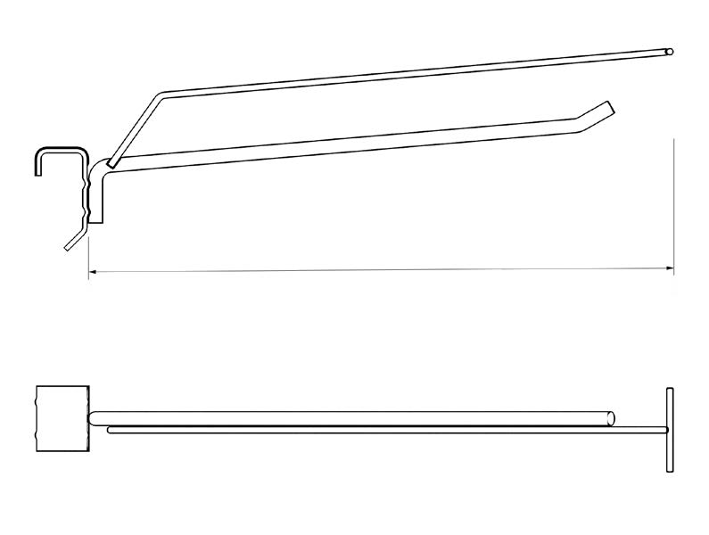 Специализированный крючок для торгового оборудования, использующего в качестве несущих элементов штанги прямоугольного сечения (профильные трубы). Благодаря плоской форме крепления, он плотно фиксируется и не вращается, обеспечивая стабильное положение товара.