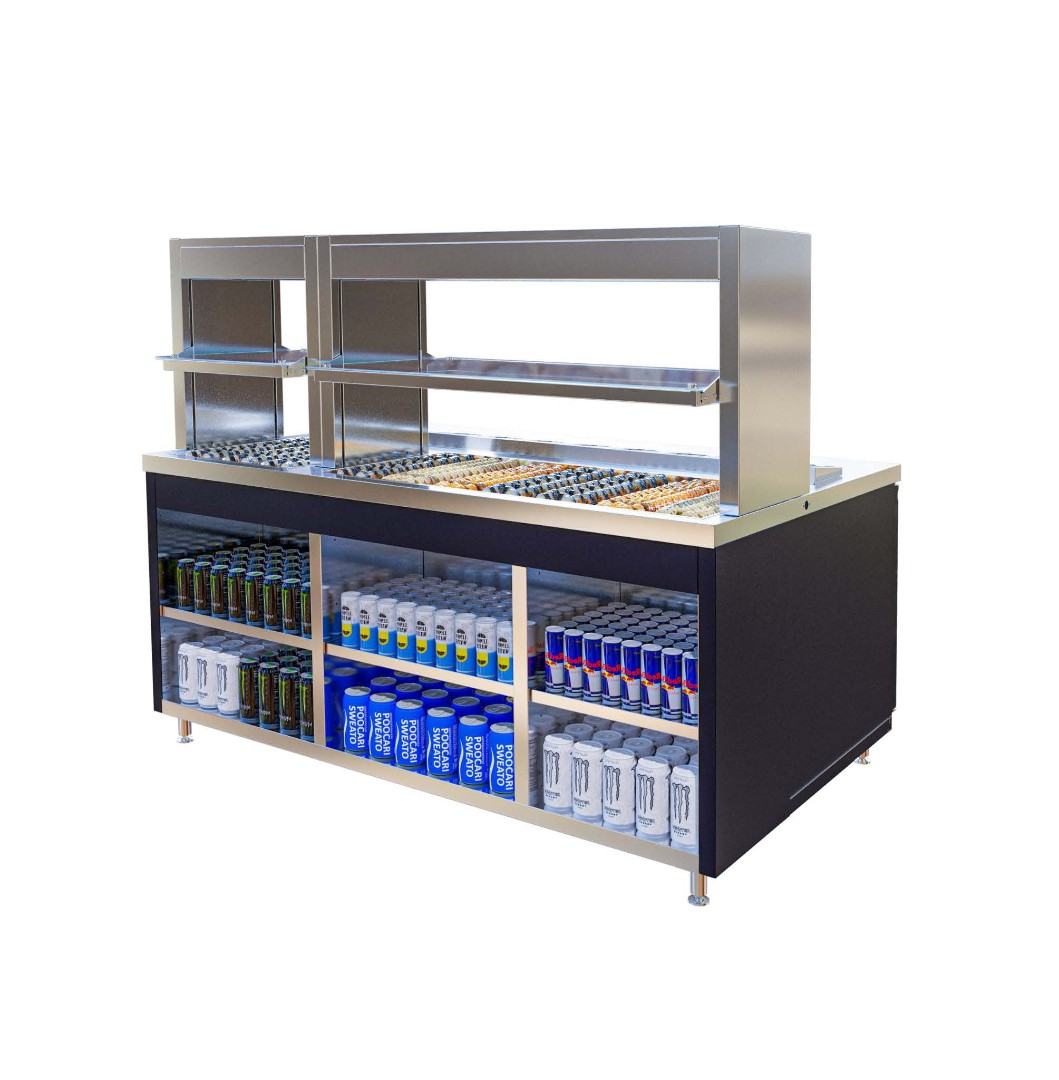 Индивидуальный дизайн под ваш бренд. Возможность брендирования и выбор отделки из различных материалов (ДСП, искусственный камень) помогает органично вписать витрины в стиль заведения и усилить визуальную идентичность.