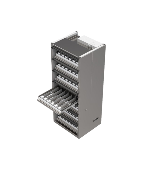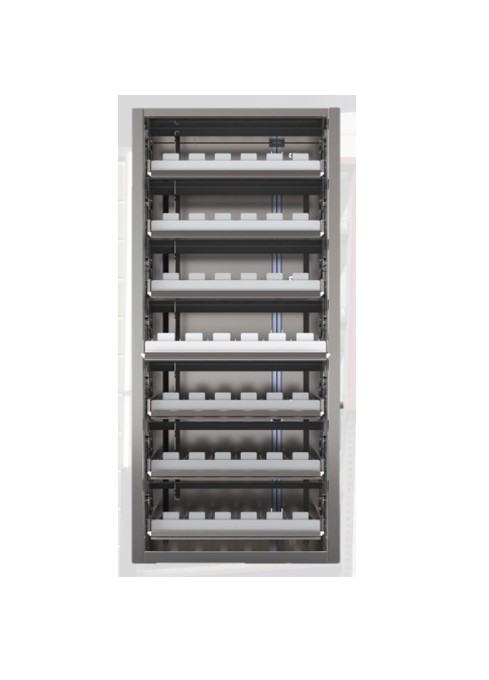 Корпус и полки шкафа изготовлены из металла (3ПС 0,6), цвет покрытия по согласованию с клиентом (RAL из стандартных линеек), полки полного выдвижения на мебельных шариковых направляющих, на полках пушечный пружинный механизм. Шторки полного синхронного открывания, изготовлены из алюминиевой композитной панели (3мм). Дивайдеры (разделители) выполнены из гибкого материала (ПЭТ), имеют три положения для установки пачек различных форматов.
