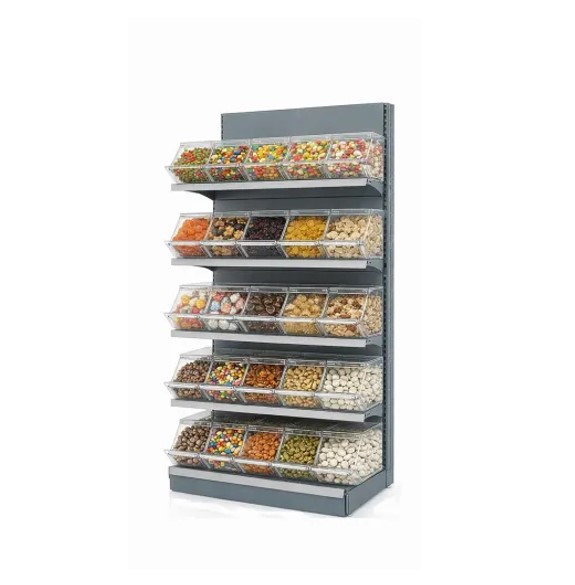 Представляем вашему вниманию стеллаж, который завоевал доверие ритейлеров как идеальное оборудование для продажи орехов и сухофруктов, а сегодня уверенно занимает место в кондитерских отделах крупнейших супермаркетов. Это универсальная система, которая легко адаптируется под любые весовые товары — от миндаля и кураги до изысканных восточных сладостей и элитных сортов шоколадных конфет.