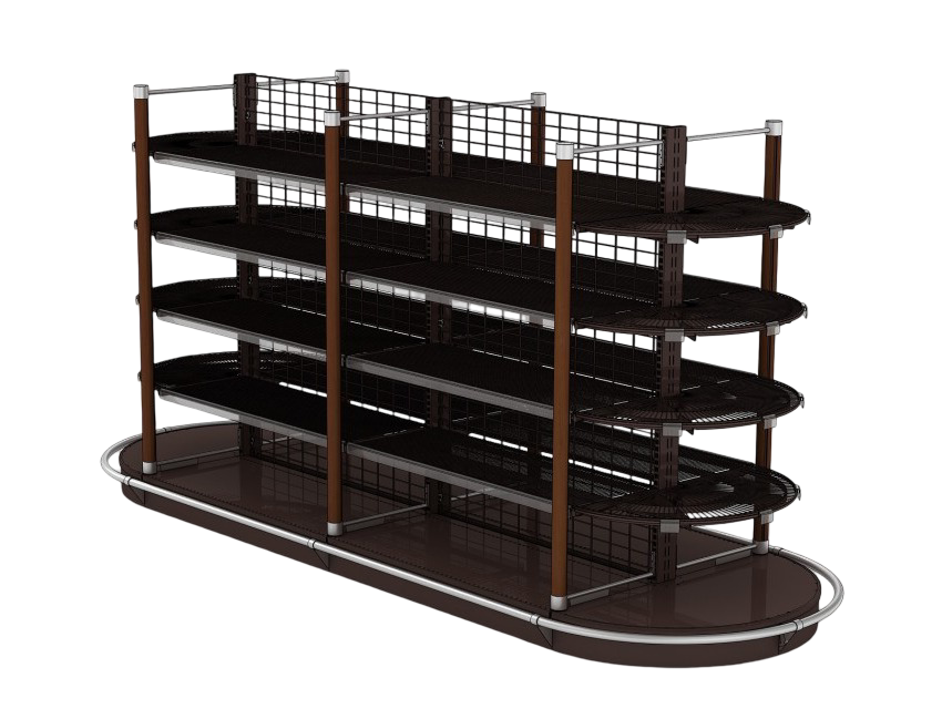 Сетчатые полки и открытая структура стеллажа обеспечивают круговой обзор 360°. Продукция просматривается с любой стороны, что особенно важно для островного размещения. Легкость конструкции не перегружает пространство, визуально расширяет зону выкладки и не создает ощущения массивности.